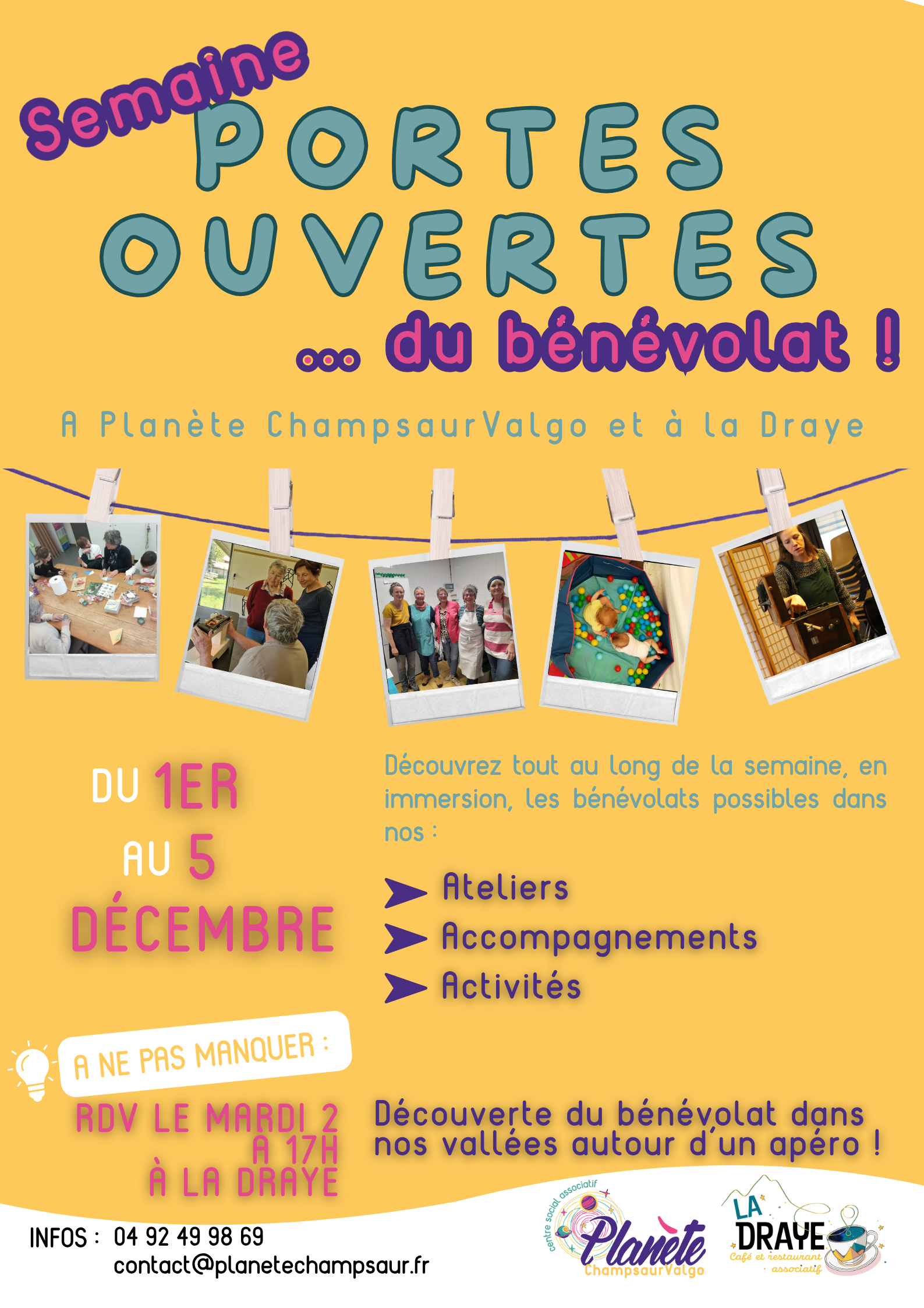 Planète ChampsaurValgo et le café associatif la Draye vous invite à découvrir tout au long de la semaine, en immersion, les bénévolats possibles dans nos ateliers, accompagnements et activités !