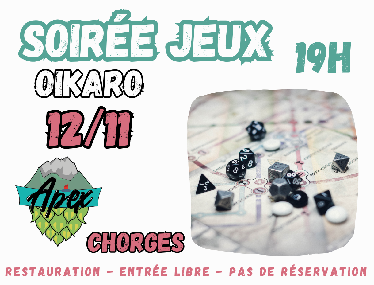 Soirée jeux avec votre animatrice oika oika Caro. Moment de convivialité, de partage autour du jeu. Conseillère ludique chez OIKA OIKA, Caro saura vous faire tester les Jeux les plus fous pour l’apéro et les plus stratégiques pour vos méninges ! Venez tester les nouveautés entre amis ! Restauration sur place Pas de réservation