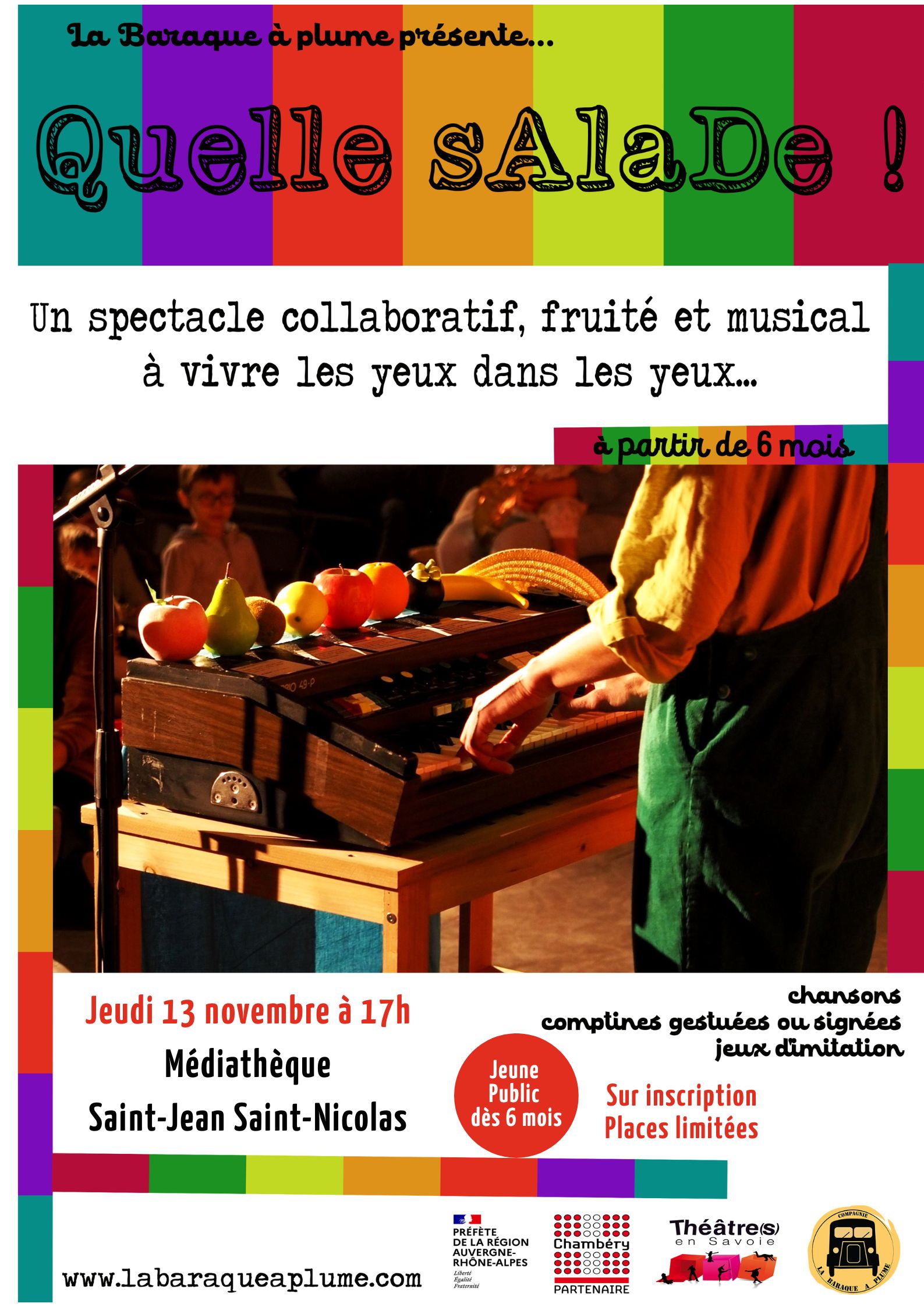 Quand Pépin a une petite faim, Bidule a un petit creux… Et si ça gargouille, il faut passer à l’action pour la tambouille ! Quelle salade ! est un bar à comptines festif et gourmand, où chansons et jeux de mots s’invitent à la table pour concocter une salade de fruits pleine de saveur… ou presque !