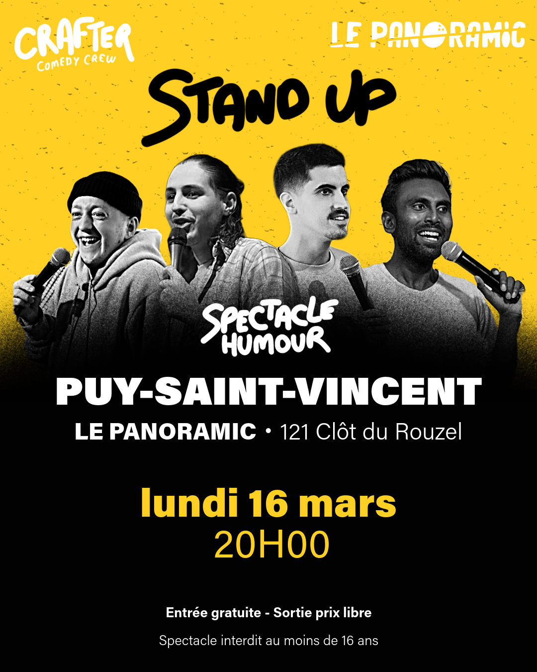 › Qui sont-ils ? Janagan, Antoine Sentenac et Remish, 3 humoristes professionnels qui sillonnent la France en camping-car pendant 1 an pour une tournée aussi audacieuse qu’inédite › Au programme : Une heure de rire assurée par ces 3 humoristes aux styles variés, mêlant blagues, improvisation et partage d’anecdotes. › Focus sur chacun des protagonistes (attention, ils se vendent un peu) : – Antoine Sentenac cumule plus de 30 000 abonnés sur Instagram. Tu l’as vu récemment dans Comedy Class sur Amazon Prime et au Paname Art Café. – Rémish, tu l’as aussi vu à la TV sur Culturebox. – Janagan Christy Et notre invité du Crafter : Kevin Robin ! › Mais ils ressemblent à quoi en fait ? Les humoristes partagent leur expérience sur les réseaux sociaux, n’hésitez pas à checker ça sur instagram, @craftercomedycrew Et si jamais vous vous demandez comment ils font pour dormir à 4 dans un camping car, vous trouverez la réponse sur youtube, @craftercomedycrew Bref ! n’hésitez pas à arriver en avance pour choper les meilleures places ! Infos pratiques Entrée gratuite • Sortie au chapeau Spectacle interdit au moins de 16 ans. Lundi 16 mars 2026 Spectacle à 20h00 [Ouverture des portes à 19h30] Salle de spectacle du Panoramic – Puy Saint Vincent Présentez-vous 15 minutes avant le spectacle : passé ce créneau, votre place ne sera plus garantie. Suivez l’aventure sur Instagram : @craftercomedycrew