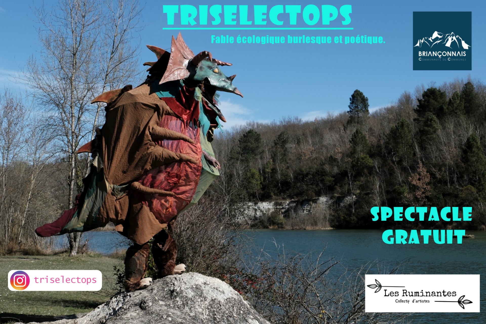 Contre-utopie écologique burlesque et poétique qui invite à une réflexion autour de la gestion et la réduction des déchets. Un étrange et gigantesque animal vient d’apparaître. Il rôde au milieu des passants, en quête de nourriture… C’est le Triselectops, créé en laboratoire par le célèbre savant Marco Pollu, qui surgit à la hâte. Secondé par Quidam, son serviteur improvisé, il réussit à maîtriser la bête et se lance sous les regards ébahis dans une absurde démonstration scientifique, vantant l’étonnante particularité de l’animal : sa capacité à ingérer tous les déchets qu’il trouve, et à les retransformer en matière première réutilisable. Marco Pollu est certain qu’en créant plus de déchets, l’humain encouragerait l’accroissement de cette nouvelle espèce, redonnant ainsi espoir à l’avenir de notre planète… Réussira-t-il à convaincre son audience ? A faire fructifier son expérience? Parviendra-t-il éternellement à dompter cet l’animal ?
