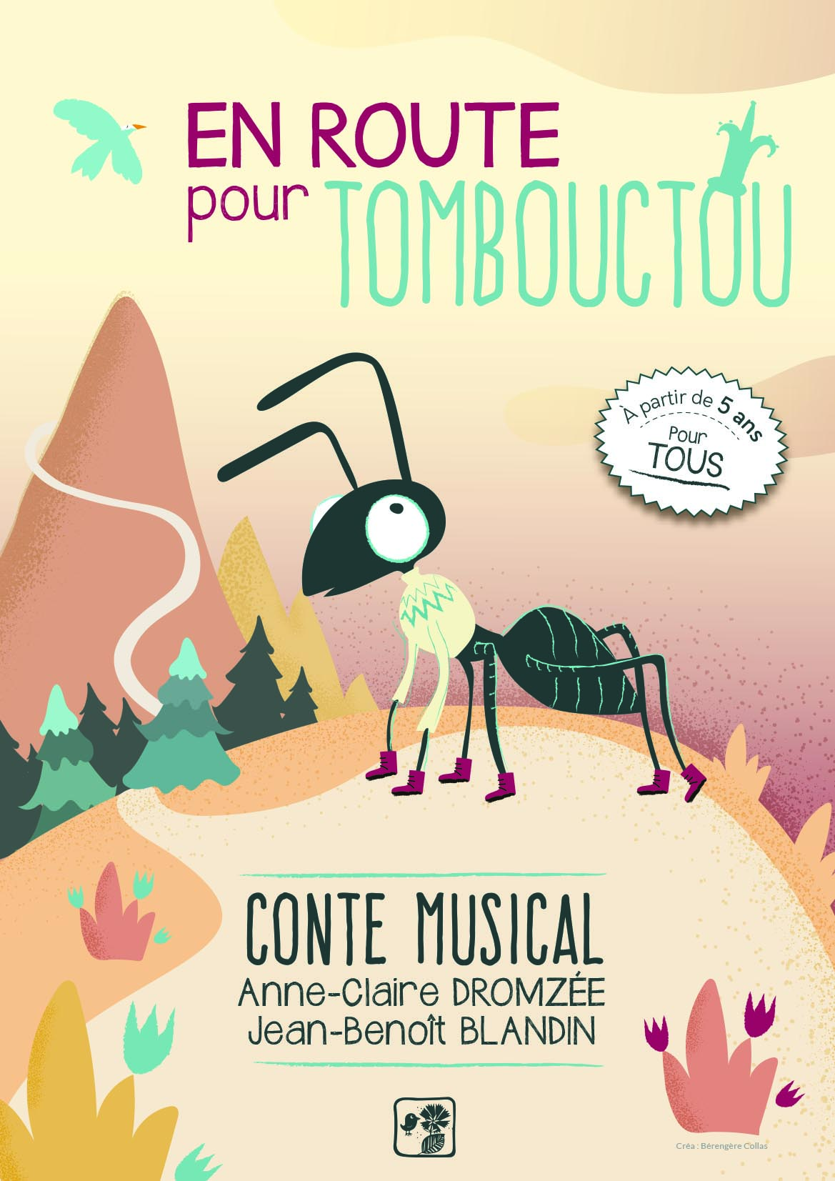 Quatre contes se conjuguent pour partir « En route pour Tombouctou ». Quatre histoires avec chacune son héros : une grand-mère qui n’a pas froid aux yeux, un merle voyageur, une fourmi intrépide et un tout petit roi en quête d’amour. Les uns comme les autres sont animés par le voyage. Que faut-il pour réussir à cheminer si ce n’est en avoir profondément envie ? Et comme dans tous les voyages, ce sont les rencontres dont on se souviendra. « Elle est partie la petite fourmi, petit à petit, trouver des amis… » Spectacle de 45 minutes pour tous, adultes et enfants à partir de 5 ans prêts à entendre le vent souffler dans les branches. Conte musical où les mots d’ Anne-Claire et la musique de Jean-Benoît s’accordent pour embarquer les spectateurs. Gratuit