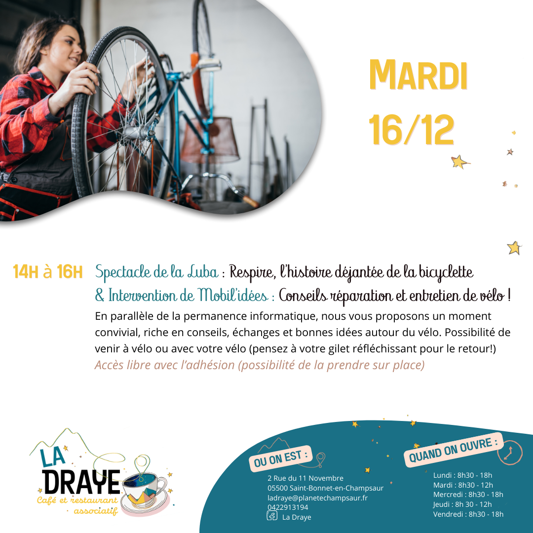 Un moment convivial, riche en conseils, échanges et bonnes idées autour du vélo. Possibilité de venir à vélo ou avec votre vélo (pensez à votre gilet réfléchissant pour le retour !)