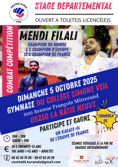Stage de karaté proposé par le Comité départemental ouvert à tou(te)s les licencié(e)s Dimanche 5 octobre de 10h à 12h et de 13h30 à 13h au gymnase de la Bâtie-Neuve.