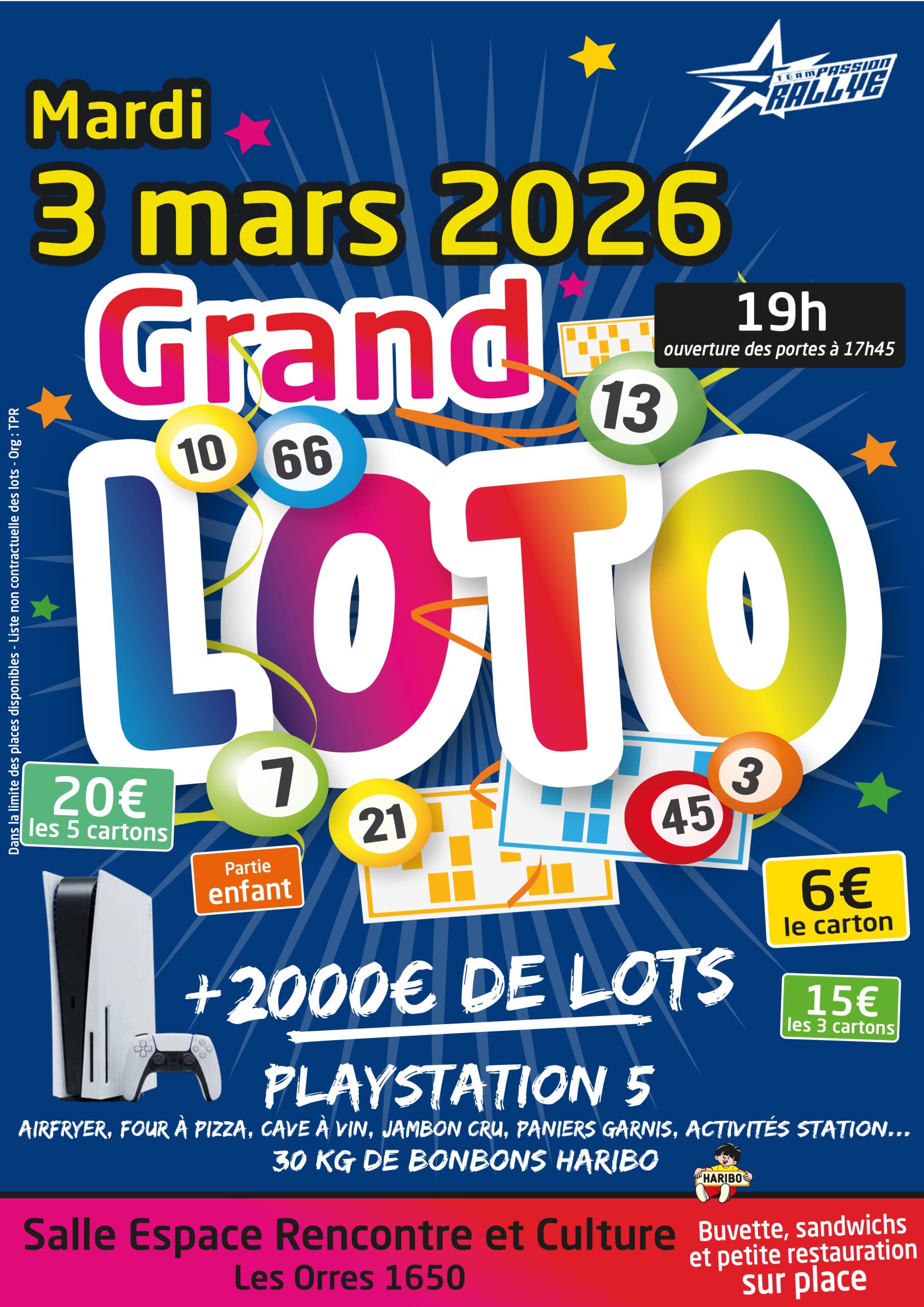 + 2000€ de lots: PLAYSTATION 5, Airfryer, Four à pizza, Cave à vin, jambon cru, paniers garnis, +30 kgs de bonbons Haribo… Org° team rallye passion Buvette, petite restauration, pas de CB. (Ouverture des portes 17h45).