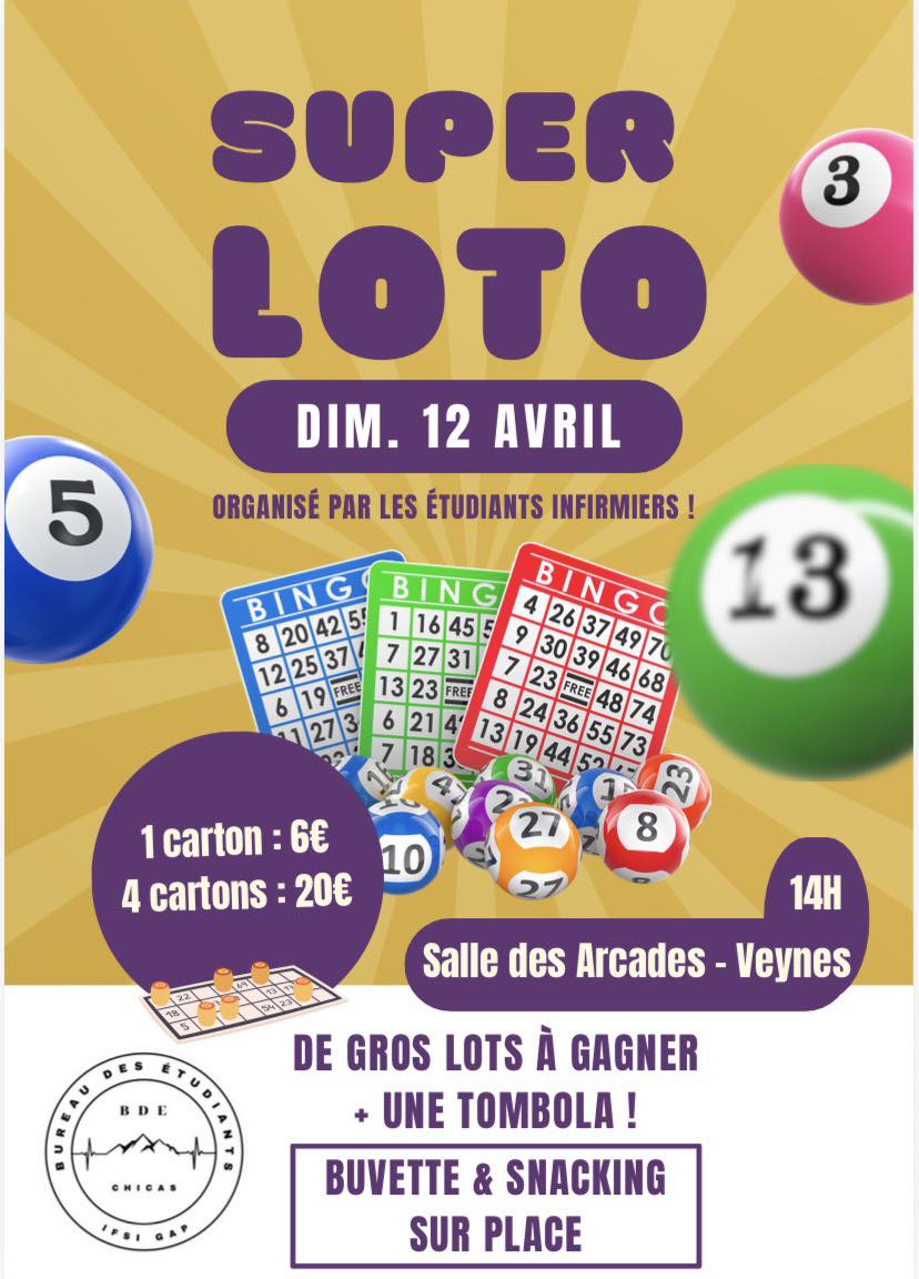 Le bureau des étudiants (BDE) de l’institut de formation en soins infirmiers de Gap vous convois au Super Loto ! Au programme : plusieurs gros lots à gagner, tombola, buvette, snacking et bonne ambiance ! De nombreuses surprises vous attendent (partie enfants, tombola, carton vide…). Quelle belle occasion de soutenir les futurs professionnels de santé tout en partageant un moment ludique.