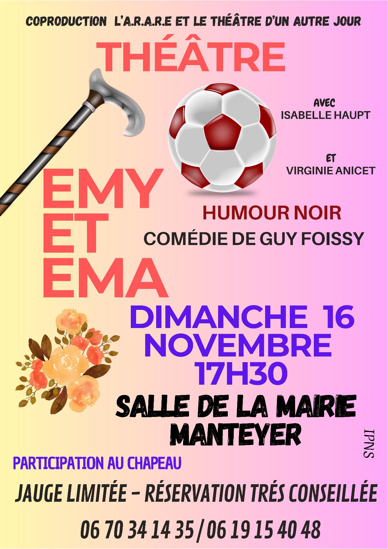 L’ARARE et le Théâtre d’un autre jour vous présente leur spectacle : Emy et Ema Une comédie de Guy Foissy Ema y est pensionnaire depuis plusieurs années et elle s’ennuie et même elle s’emm…. Alors elle raconte des histoires vraies ou pas, et on peut se demander jusqu’à quel point elle y croit ….. Emy, visiteuse bénévole, vient la voir régulièrement. Réservations (très conseillée) et renseignements : 06 70 34 14 35 ou 06 19 15 40 48