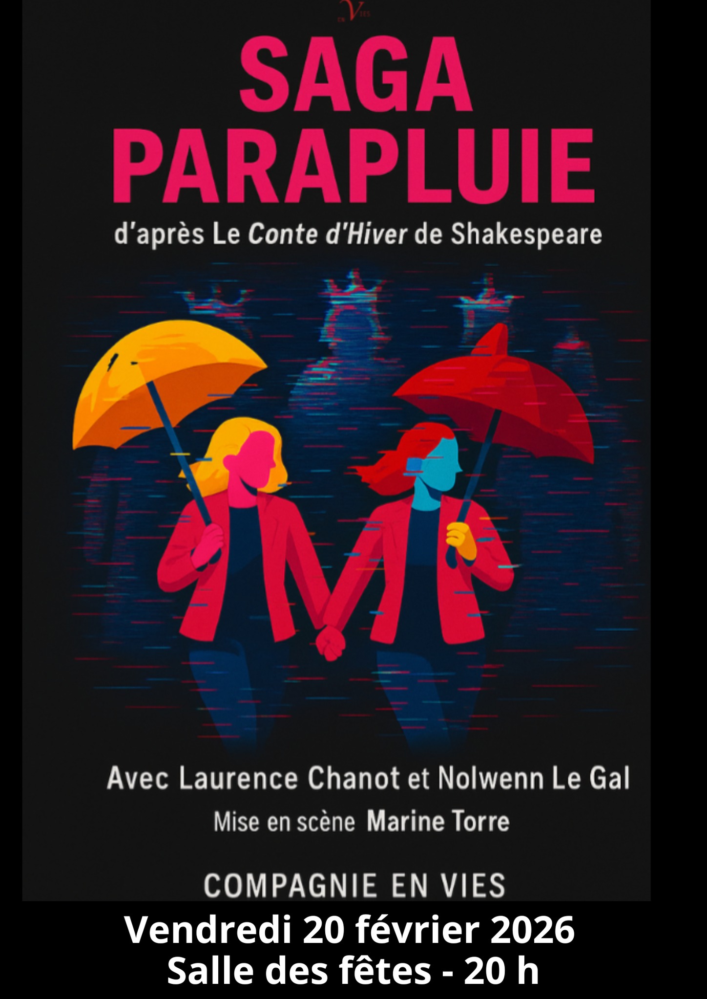 SAGA PARAPLUIE : Dans un studio télé chaotique, deux présentatrices replongent dans les archives du Conte d’Hiver. Mais lorsqu’un problème technique survient en direct, elles doivent improviser et prendre la suite de l’histoire. Elles endossent alors les rôles de personnages hauts en couleurs, les questionnent, et les décortiquent avec humour. Entre jalousie royale, identités perdues, vérités bousculées, et violence systémique, la tragédie devient un feuilleton haletant où tout peut déraper. Faire la meilleure audience, oui mais à quel prix? Alors, à vous les studios, nous sommes en direct dans 3…2…1 !