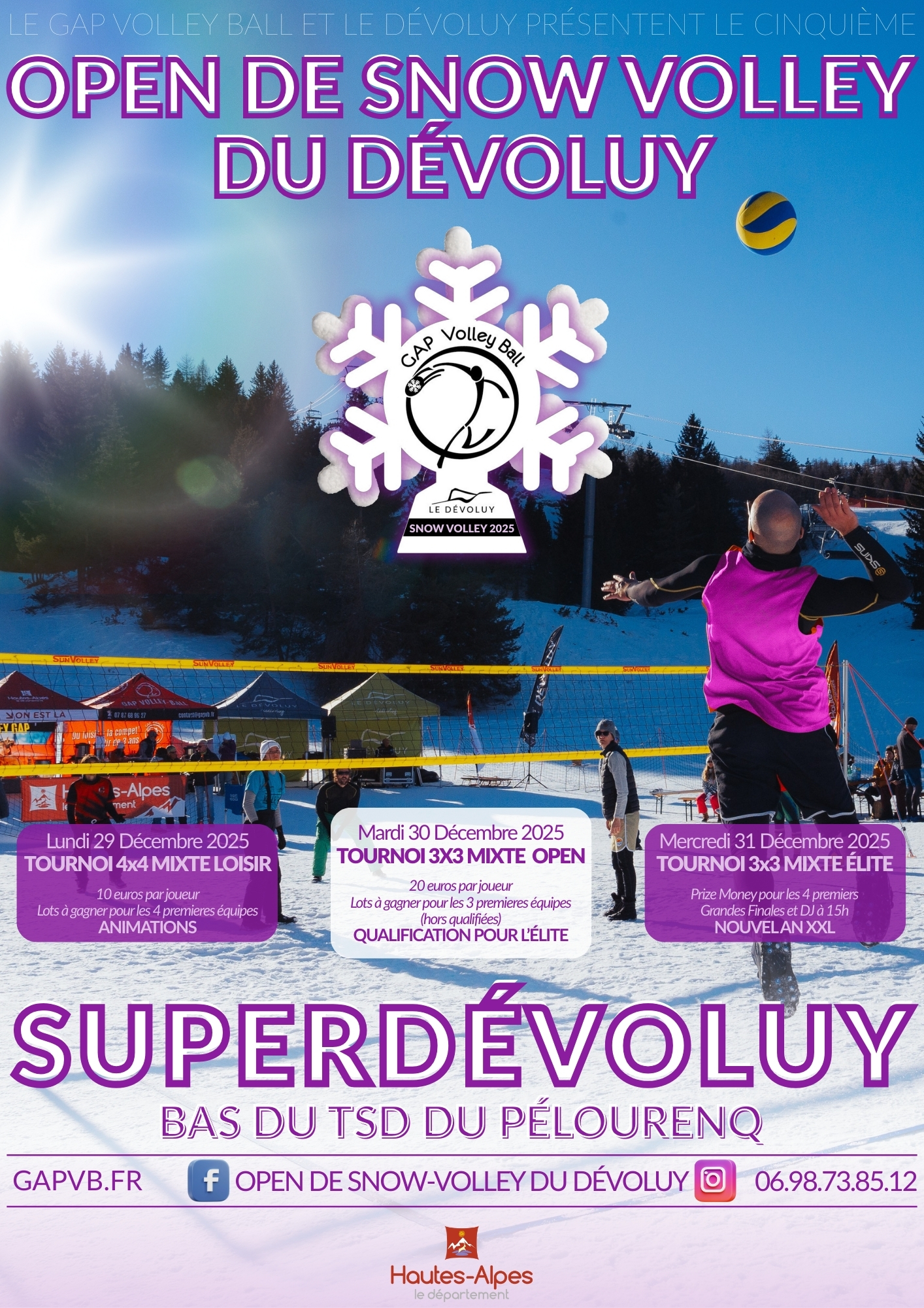 L’Open de Snow Volley du Dévoluy revient pour une cinquième année consécutive à Superdévoluy ! 3 jours de sport (snow volley et mobil sport) et de festivités (speaker et DJ) au pied du télésiège du Pélourenq : tournoi 4×4 mixte ouvert à toutes et tous le 29 décembre et tournoi 3×3 compétition et élite, les 30 et 31 décembre avant de profiter des célébrations du Nouvel An proposées par l’Office de Tourisme ! Ce tournoi est organisé par le Gap Volley Ball et l’Office de Tourisme. Plus d’information au 06 98 73 82 12. Le programme : ☃️ Lundi 29 Décembre : Tournoi 4×4 MIXTE niveau Loisir Que vous soyez joueur ou non, tout le monde va se faire plaisir avec cette formule ouverte à toutes et tous ! – Limité à 16 équipes avec une fille minimum – Règles de volley ball classique – Début des matchs à 10h – Finales à 16h45 – Inscription : 10 euros par personne Lots pour les 4 premières équipes Des animations sportives et festives seront proposées toute la journée ☃️ Mardi 30 Décembre : Tournoi 3×3 MIXTE OPEN Réservé aux joueuses et joueurs de niveau départemental minimum. Ce tournoi limité à 20 équipes permettra aux 8 meilleures équipes de la phase de poule de se qualifier pour le tournoi ELITE du lendemain. Le tournoi se terminera sous forme de matchs à élimination directe pour les équipes non qualifiées. – Limité à 20 équipes avec une fille minimum (possible de s’inscrire à 4 avec un remplaçant) – Règles officielles du SNOW VOLLEY – Début des matchs à 9h – Fin des matchs de poule à 14h – Finales à 16h45 – Textile offert à tous les participants Inscription : 20 euros par personne Lots pour les 3 premières équipes (hors 8 équipes qualifiées) ☃️ Mercredi 31 Décembre : Tournoi 3×3 MIXTE ÉLITE – Début des matchs à 10h – Finales à 15h puis remises des prix. Ambiance festive dès 12h et DJ à partir de 15h Prize Money pour les 4 premiers : 600 / 450 / 300 / 150 Apéritif partagé pour tous les participants au tournoi Nouvel an sur le front de neige avec DJ et Feu d’artifice offerts par l’Office de Tourisme du Dévoluy Nuit de folie à la Fournaise Les inscriptions sont ouvertes sur le site du GAPVB.FR