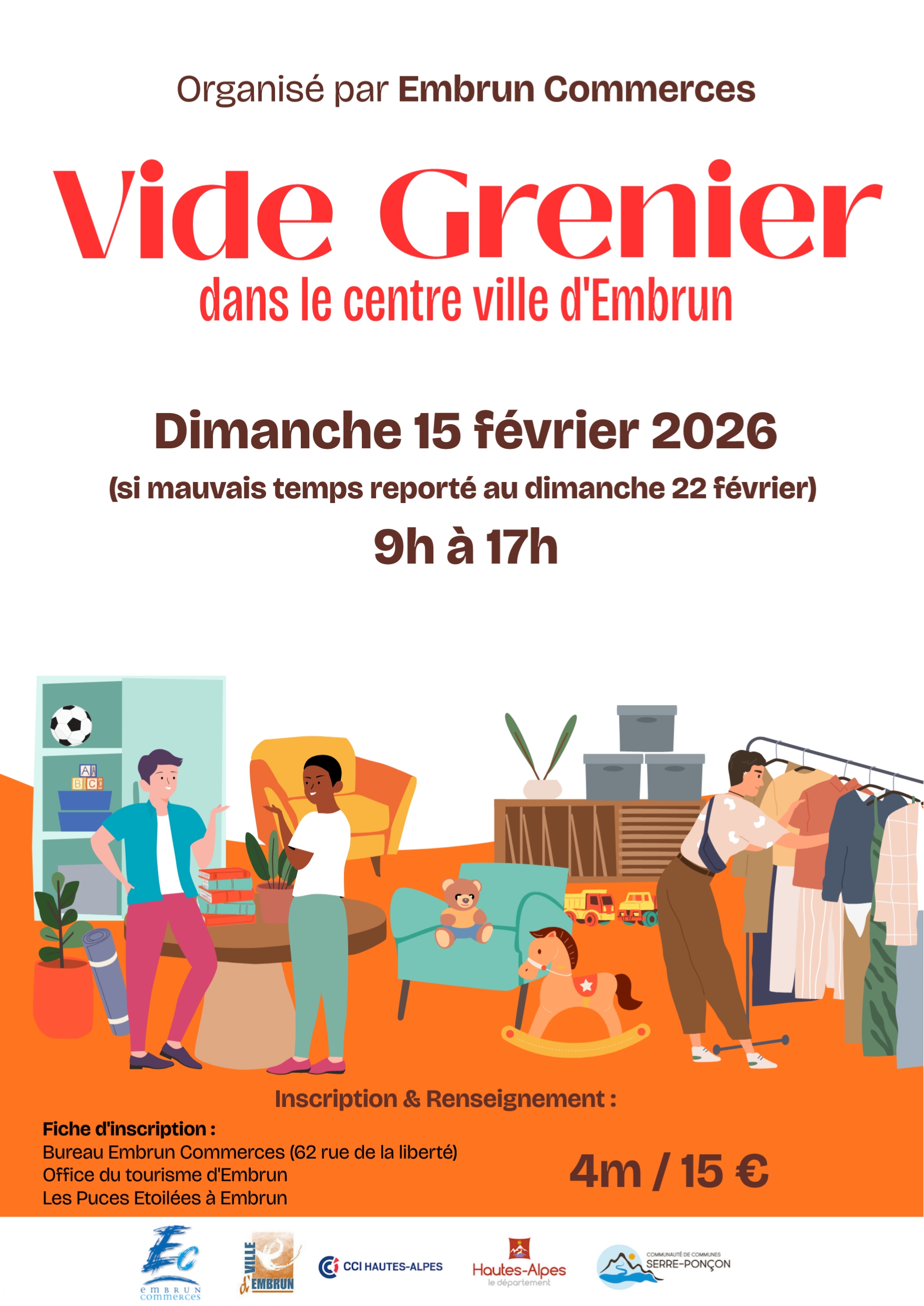 Une journée conviviale et animée pour chiner, vendre et donner une seconde vie aux objets du quotidien : vêtements, jouets, livres, décoration, petit mobilier et bien plus encore. En cas de mauvais temps, l’événement sera reporté au dimanche 22 février 2026. Inscriptions & renseignements : Fiche d’inscription à remettre au Bureau Embrun Commerces – 62 rue de la Liberté. Les Puces Étoilées à Embrun. Possibilité de récupérer la fiche d’inscription à l’Office de Tourisme d’Embrun Serre-Ponçon.
