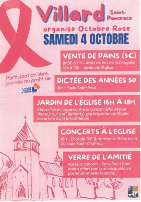 À l’occasion d’Octobre Rose, Villard-Saint-Pancrace propose un programme riche et varié : vente de pains le matin, de 8h30 à 11h à l’arret de bus de la chapelle et l’après midi de 16h à 18h au jardin de l’Église, dictée rétro des années 50, ateliers créatifs, animations pour petits et grands, ouverture de la bibliothèque. En fin d’après-midi, l’église accueillera la chorale TNT et l’harmonie l’Écho de la Guisane pour un concert caritatif. La journée s’achèvera par un verre de l’amitié offert par la municipalité. Un moment de partage et de mobilisation au profit de la Ligue contre le cancer.