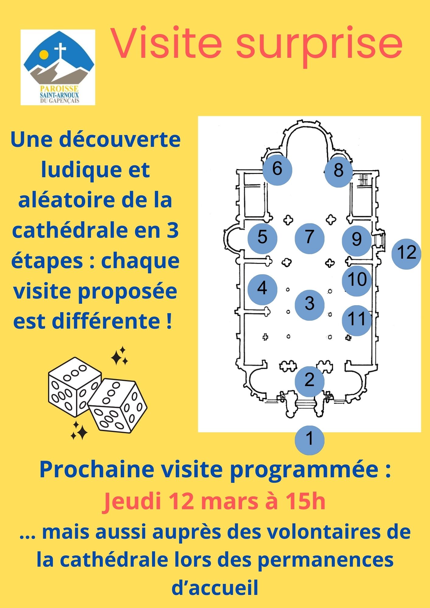 Vous avez un quart d’heure pour découvrir la cathédrale Notre-Dame de l’Assomption et Saint-Arnoux, monument emblématique de Gap ? La visite-surprise, aléatoire et ludique, est faite pour vous : lancez les dés trois fois et partez à la découverte de trois facettes de la cathédrale, pour une visite à chaque fois renouvelée. Les volontaires de la cathédrale se tiendront cependant disponibles pour répondre ensuite à toutes les questions qui vous seront peut-être venues !
