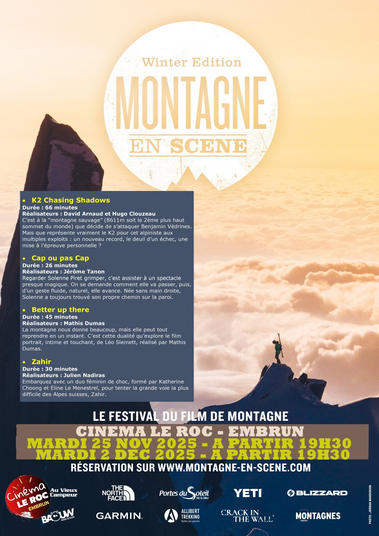 Au programme 4 films d’exceptions ! – K2 Chasing Shadows Réalisateurs : David Arnaud et Hugo Clouzeau Durée : 66 minutes C’est à la “montagne sauvage” (8611m soit le 2ème plus haut sommet du monde) que décide de s’attaquer Benjamin Vedrines. Mais que représente vraiment le K2 pour cet alpiniste aux multiples exploits : un nouveau record, le deuil d’un échec, une mise à l’épreuve personnelle ? – CAP OU PAS CAP Réalisateur : Jérôme Tanon Durée : 26 minutes Regarder Solenne Piret grimper, c’est assister à un spectacle presque magique. On se demande comment elle va passer, puis, d’un geste fluide, naturel, elle avance. Née sans main droite droite, Solenne a toujours trouvé son propre chemin sur la paroi. – BETTER UP THERE Réalisateurs : Mathis Dumas Durée : 45 minutes La montagne nous donne beaucoup, mais elle peut tout reprendre en un instant. C’est cette dualité qu’explore le film portrait, intime et touchant, de Léo Slemett, réalisé par Mathis Dumas. – ZAHIR Réalisateur : Julien Nadiras Durée : 30 minutes Embarquez avec un duo féminin de choc, formé par Katherine Choong et Eline Le Menestrel, pour tenter la grande voie la plus difficile des Alpes Suisses, Zahir.
